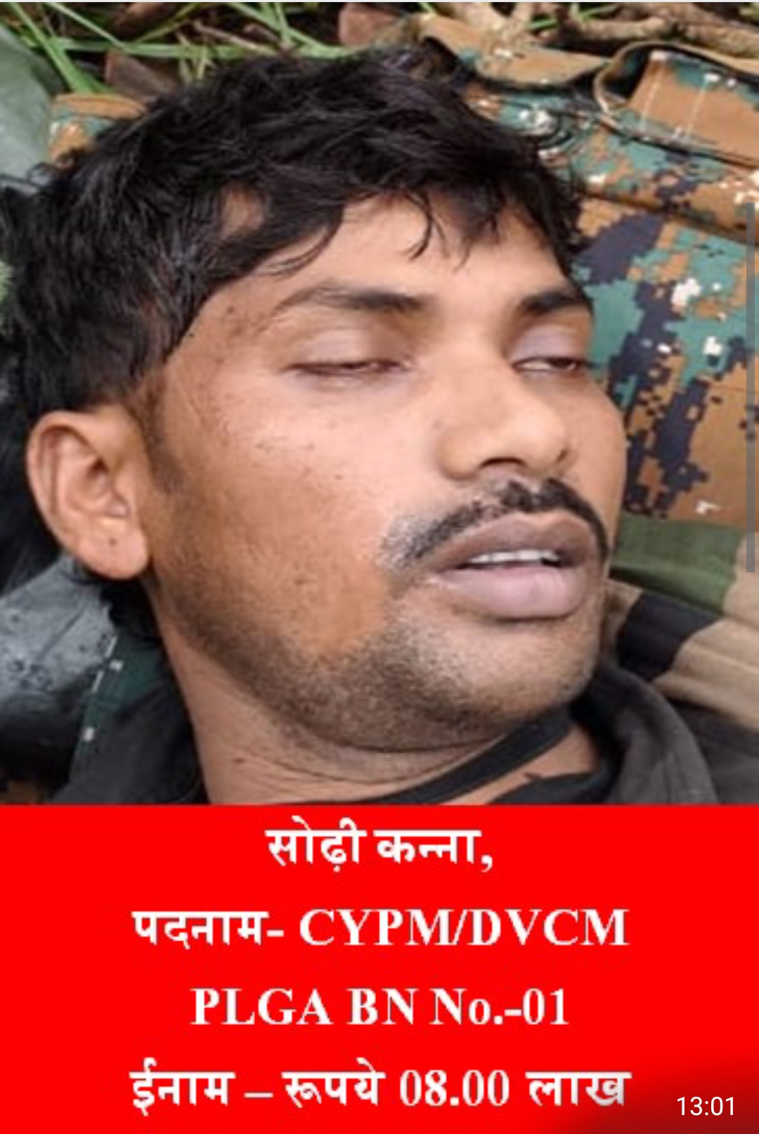 🔷 *बीजापुर जिले के नेशनल पार्क क्षेत्र में हुई मुठभेड़ के दौरान ₹08 लाख का इनामी माओवादी डिप्टी कमांडर सोढ़ी कन्ना का शव हथियार सहित बरामद हुआ।*