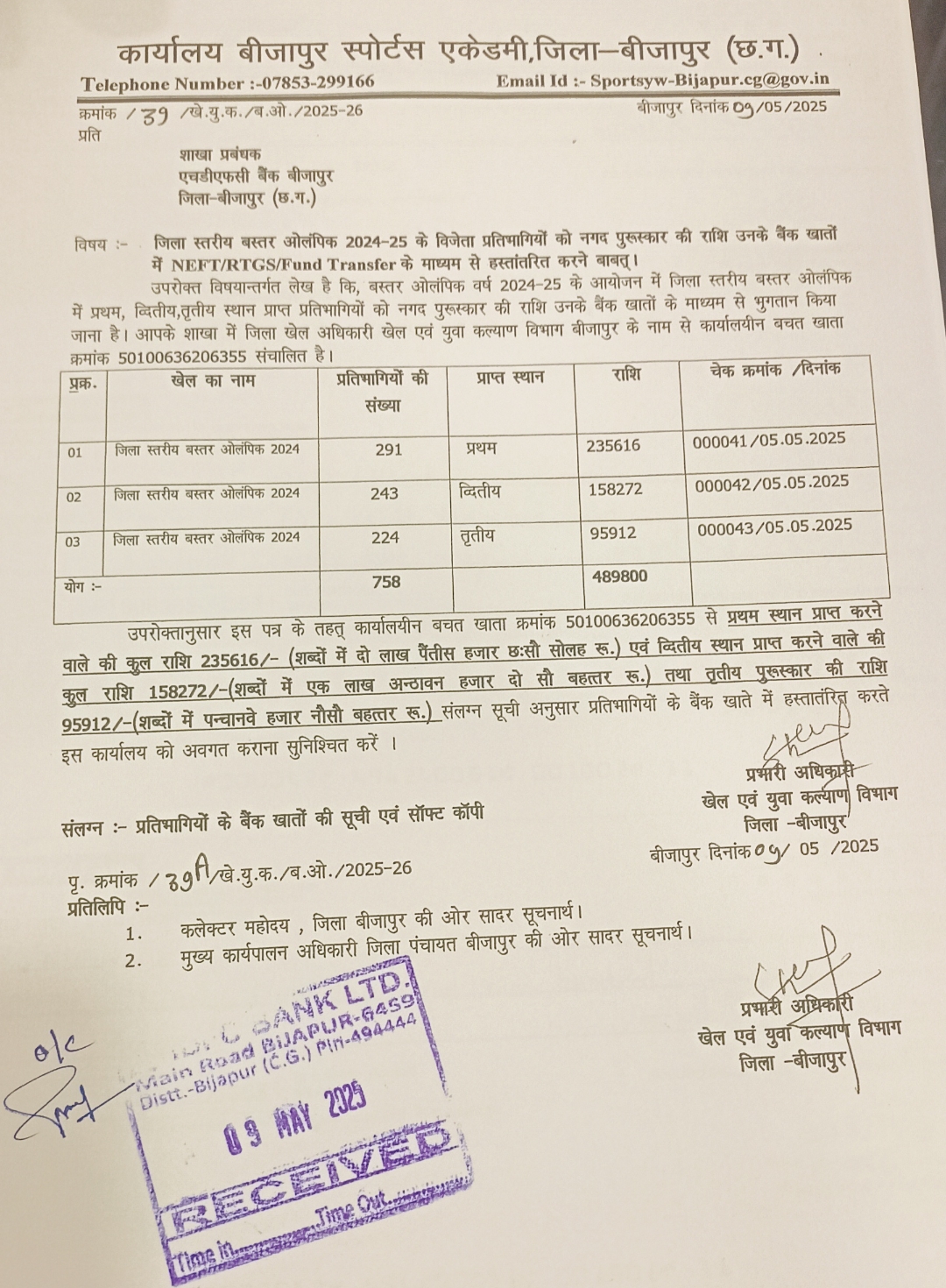 तत्काल खिलाड़ियों के खाते में पैसे डलवाने हेतु भेजा बैंक ‘